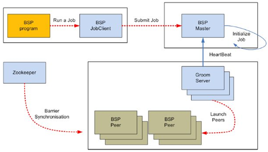 一个 BSPMaster 或者多个 grooms 服务器是通过脚本启动的,在 Groom 服务器中还包含了 BSPeer 的实例,在启动 GroomServer 的时候就会启动了 BSPPeer,BSPPeer 是整合在 GrommServer 中的,GrommServer 通过 PRC 代理与 BSPmaster 连接。当 BSPmaster、GroomServer 启动完毕以后,每个 GroomServer 的生命周期通过发送 ” 心跳 ” 信息给 BSPmaster 服务器,在这个 ” 心跳 ” 信息中包含了 GrommServer 服务器的状态,这些状态包含了能够处理任务的最大容量,和可用的系统内存状态,等等。