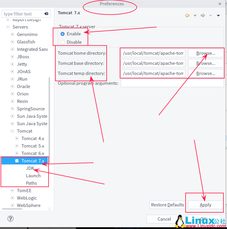—> 去选 enable —> 为其添加 tomcat 安装路径到 home directory —> apply