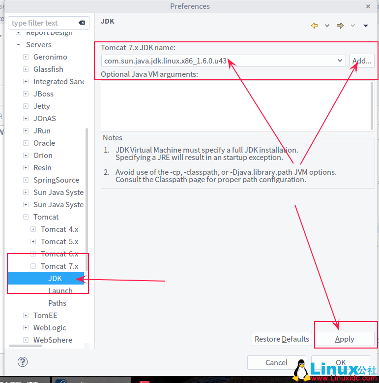 —>tomcat 7.x —> jdk —> 选取自己安装的 jdk 版本 —> apply
