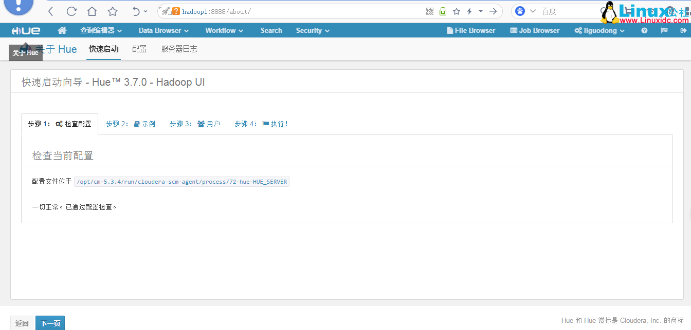 首次登陆 Hue 会让设置一个初试的 username 和 password,设置好,登陆到后台。会做一次检查,一切正常后会提示。