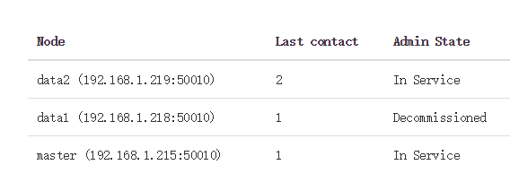 在小集群中(例如 3 台机器),如果 datanode 数据量小于文件的备份数设置(默认是 3),有可能会出现这样的情况,被数据节点一直处于 Decommission in progress 状态。