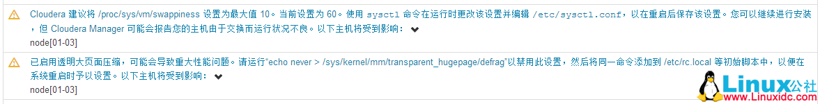 在试安装的过程,发现 Cloudera 给出了一些警告,如下图: