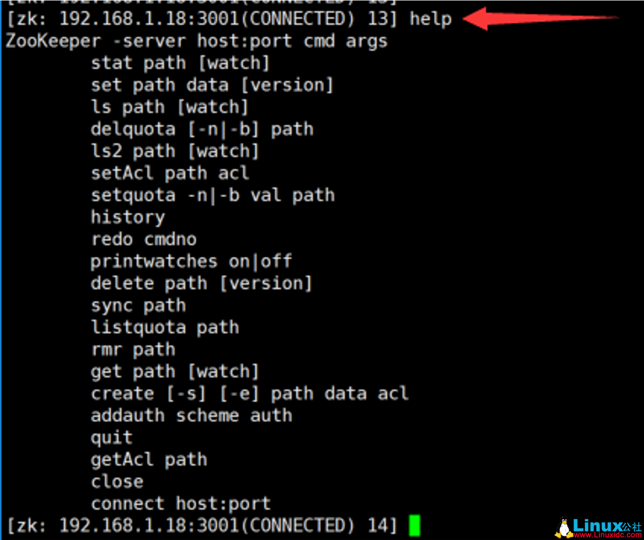 1 [zk: 192.168.1.18:3003(CONNECTED) 11] help