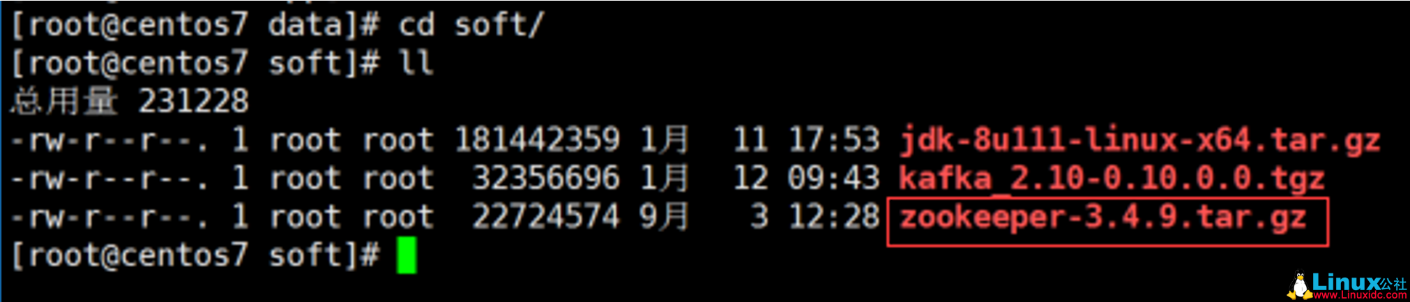 1. 在 zookeeper 官网下载压缩包到 /data/soft 目录,此文下载版本为 zookeeper-3.4.9.tar.gz