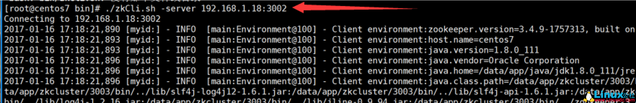 1 [root@centos7 bin]# ./zkCli.sh -server 192.168.1.18:3002