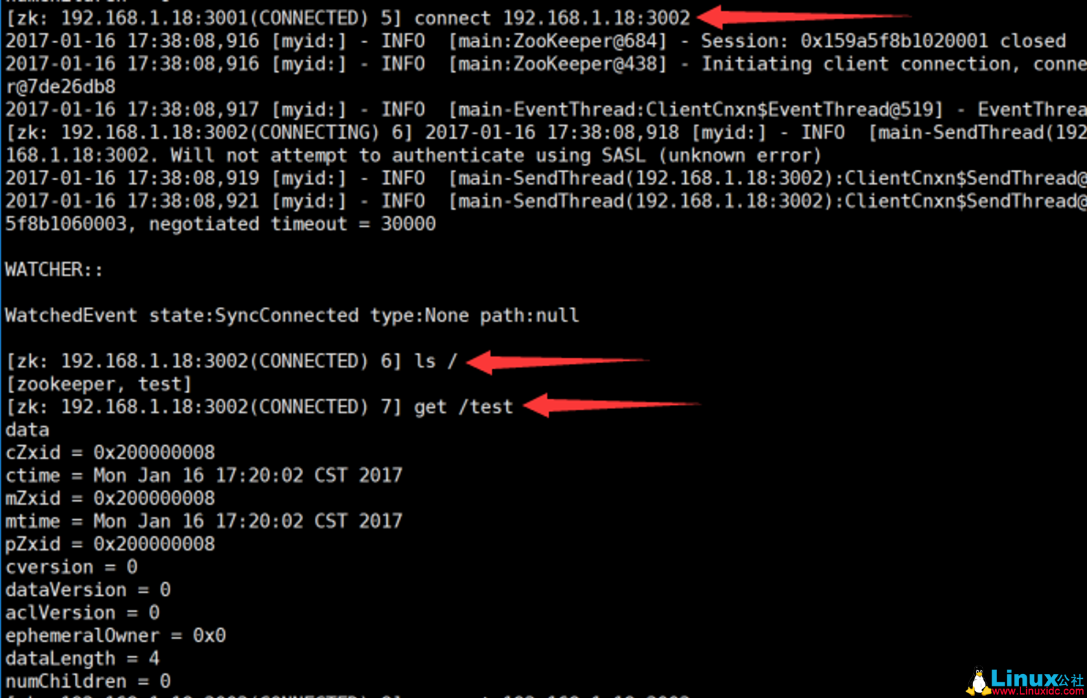 1 [zk: 192.168.1.18:3002(CONNECTED) 2] connect 192.168.1.18:3001