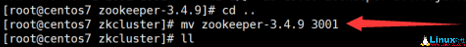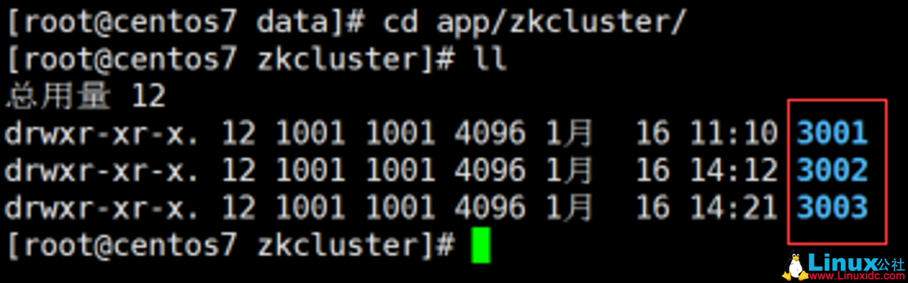 1 [root@centos7 zkcluster]# mv zookeeper-3.4.9 3001