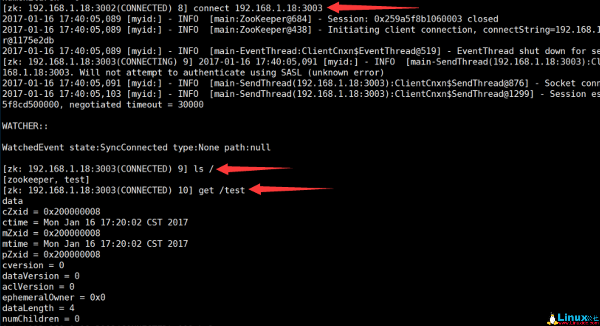 1 [zk: 192.168.1.18:3002(CONNECTED) 8] connect 192.168.1.18:3003
