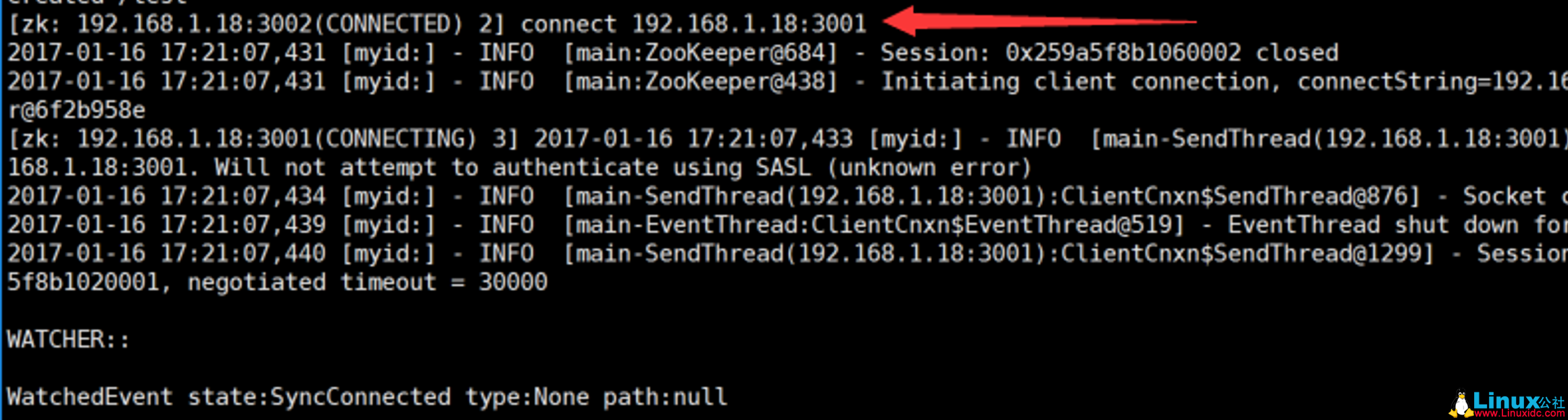 1 [zk: 192.168.1.18:3001(CONNECTED) 5] connect 192.168.1.18:3002