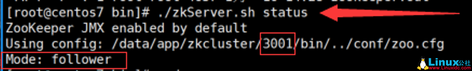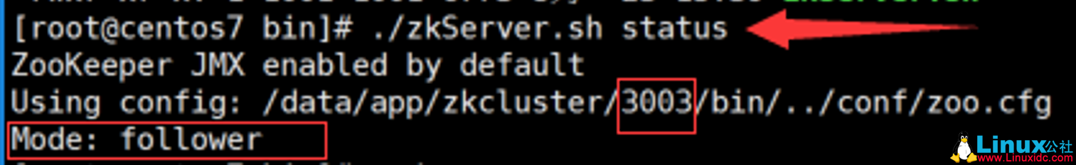 1 [root@centos7 bin]# ./zkServer.sh status