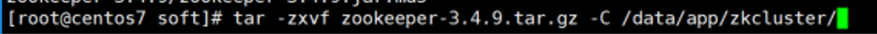 1 [root@centos7 soft]# tar -zxvf zookeeper-3.4.9.tar.gz -C /data/app/zkcluster
