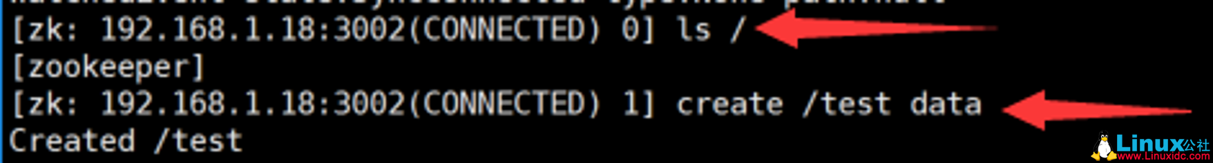 3 [zk: 192.168.1.18:3002(CONNECTED) 1] create /test data