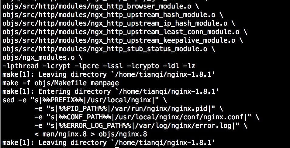 [root@Server1 nginx-1.8.1]# ./configure --prefix=/usr/local/nginx --sbin-path=/usr/local/nginx/sbin/nginx --conf-path=/usr/local/nginx/conf/nginx.conf --error-log-path=/var/log/nginx/error.log --http-log-path=/var/log/nginx/access.log --pid-path=/var/run/nginx/nginx.pid --lock-path=/var/lock/nginx.lock --user=nginx --group=nginx --with-http_ssl_module --with-http_stub_status_module --with-http_gzip_static_module --http-client-body-temp-path=/var/tmp/nginx/client/ --http-proxy-temp-path=/var/tmp/nginx/proxy/ --http-fastcgi-temp-path=/var/tmp/nginx/fcgi/ --http-uwsgi-temp-path=/var/tmp/nginx/uwsgi --http-scgi-temp-path=/var/tmp/nginx/scgi --with-pcre