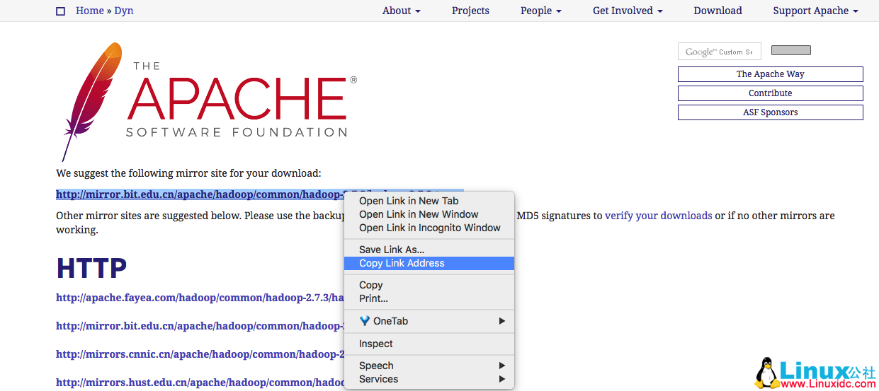 登录 Hadoop 的官方下载地址,选择你需要的版本,复制下载链接,这里我选用最新的 2.7.3 版本: