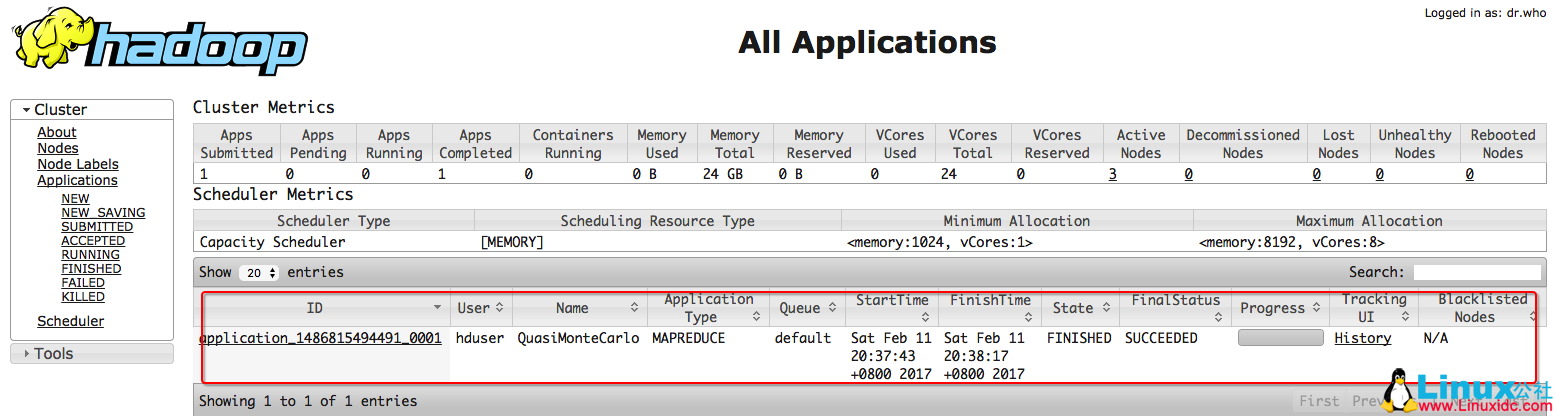执行之后通过浏览器访问:http://master:8088/cluster/apps