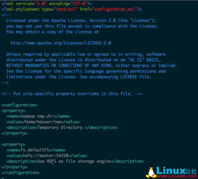 ①在 master 和 slave 节点上更改 ”core-site.xml” 文件,master 和 slave 节点应该使用相同 ”fs.defaultFS” 值,而且必须指向 master 节点; 在“configuration”中间添加如下配置: