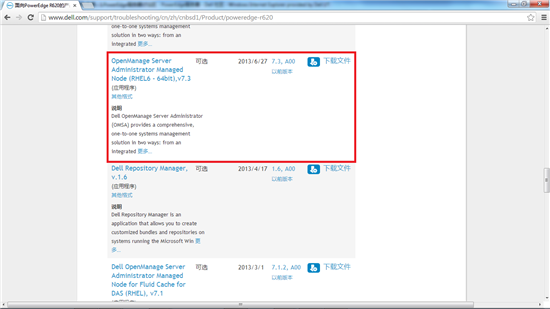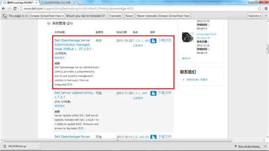 3. 本例操作系统选择“RedHat Enterprise Linux 6”,然后向下拉动滚动条到“系统管理”章节,下载本例对应的 OMSA v7.3(RHEL 6 64bit),文件名“OM-SrvAdmin-Dell-Web-LX-7.3.0-350_A00.RHEL6.x86_64.tar.gz”,以及补丁 v7.3.0.1,文件名 ”OM_RHEL6.tar.gz”