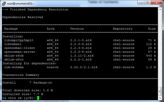 如下图,是使用 yum 安装的截屏,输入“y”,并回车完成安装(注意:yum 自动添加了cim-schema)