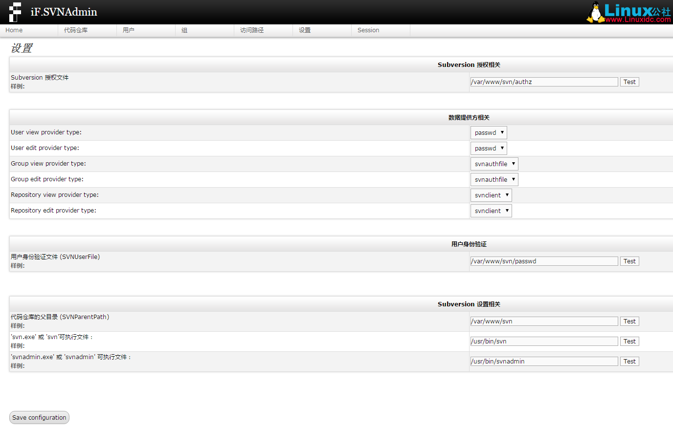 启动 webserver 服务后,浏览器地址输入 http://ip/svnadmin 出现配置界面,输入下图中配置信息,输入每个配置信息可以点击旁边的 Test 测试是否输入正确,最后保存配置