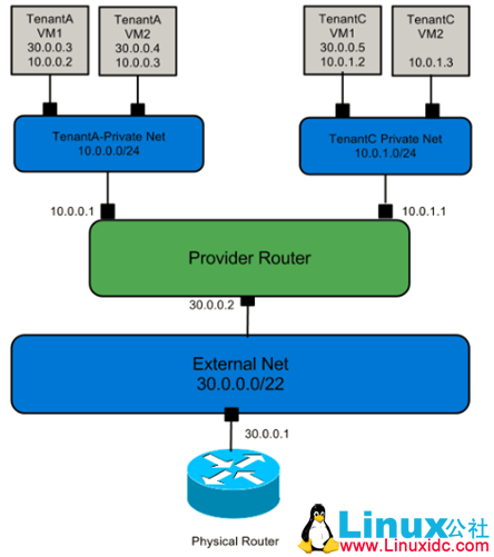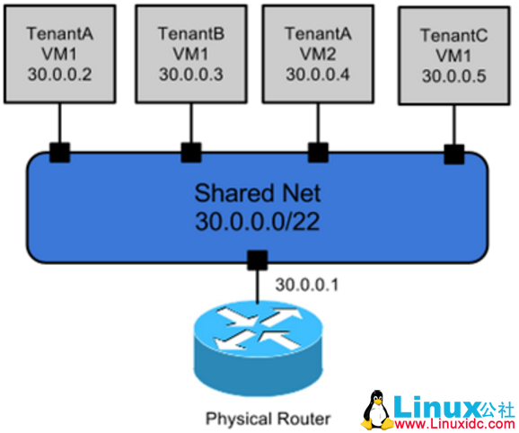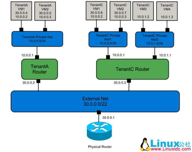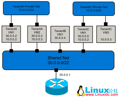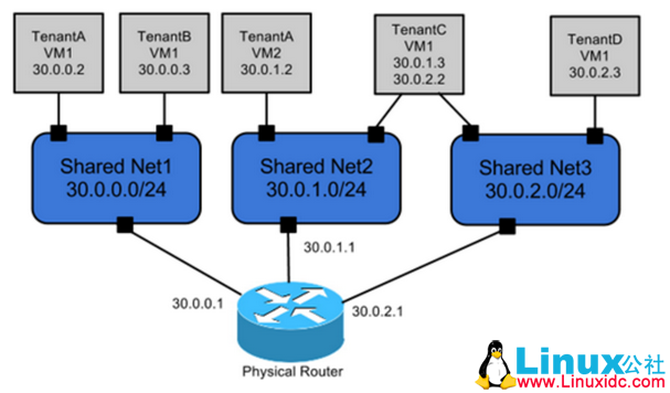 在 openstack 中使用 VLAN 技术引入了多租户机制,虚拟机可以使用不同的私有 IP 段,并且一个租户可以拥有多个 IP 段,以实现不同租户的网络隔离。但是,如果不同租户逻辑上共用一个网关,则无法实现租户间 IP 地址的复用。