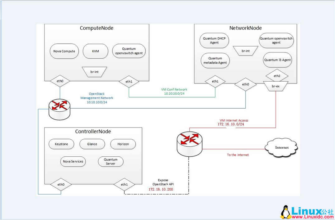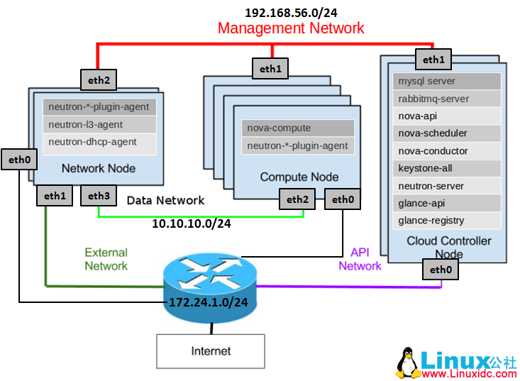 1,External Network/API Network,这个网络是连接外网的,无论是用户调用 Openstack 的 API,还是创建出来的虚拟机要访问外网,或者外网要 ssh 到虚拟机,都需要通过这个网络;