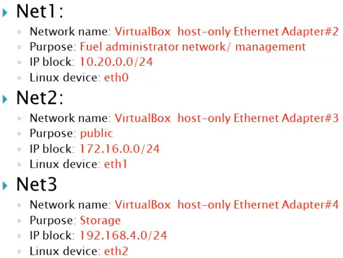 本次安装采用最简方式,不涉及 HA,仅作多节点部署。fuel_master 节点作为 pxe 服务器和管理用,fuel_controller 即 openstack 控制节点,fuel_compute 就是计算节点,真正可使用的资源。