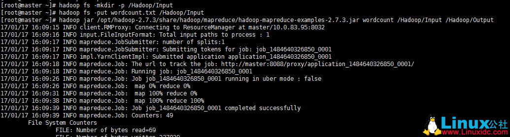 hadoop jar /opt/hadoop-2.7.3/share/hadoop/mapreduce/hadoop-mapreduce-examples-2.7.3.jar wordcount /Hadoop/Input /Hadoop/Output