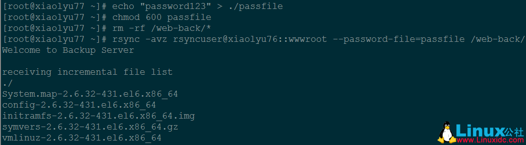 [root@xiaolyu77 ~]# rsync -avz rsyncuser@xiaolyu76::wwwroot –password-file=passfile /web-back/
