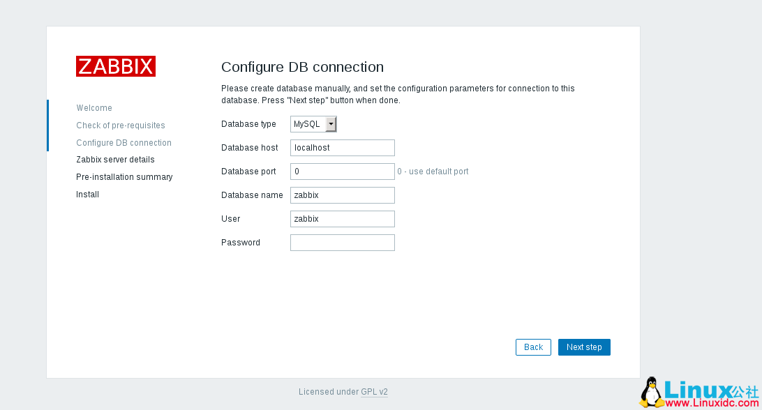 插入 MySQL zabbix 用户密码,然后点击Next step.
