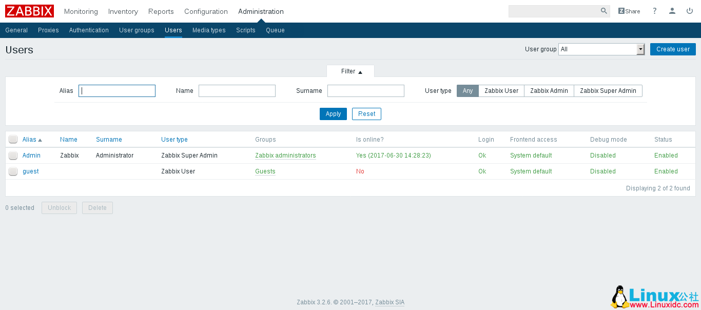 进入 Administration – >Users,了解启用的帐户的概述