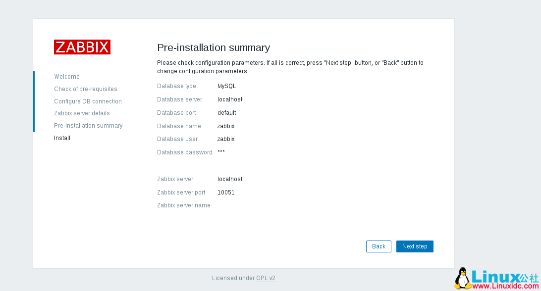 单击 Next step,安装程序将显示具有所有配置参数的以下页面。 再次检查以确保一切正确..