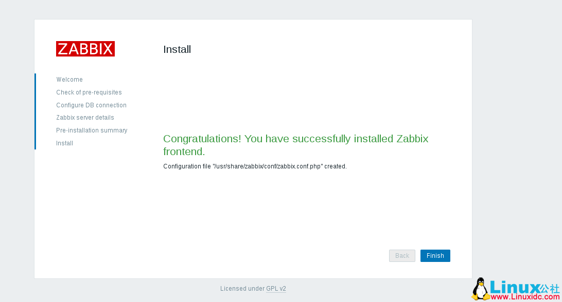 单击 finish 以完成前端安装。 默认用户名为 admin,以 zabbix 为密码。