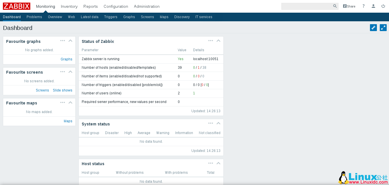 使用上述凭证登录后,我们将看到 Zabbix 仪表板: