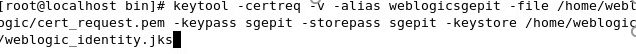 keytool-certreq -v -alias weblogicsgepit -file /home/weblogic/cert_request.pem-keypass sgepit -storepass sgepit -keystore/home/weblogic/weblogic_identity.jks