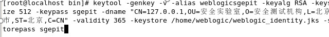 keytool-genkey -v -alias weblogicsgepit -keyalg RSA -keysize 512 -keypass sgepit-dname “CN=127.0.0.1,OU= 安全实验室,O= 安全测试机构,L= 北京市,ST= 北京,C=CN”-validity 365 -keystore /home/weblogic/weblogic_identity.jks -storepass sgepit