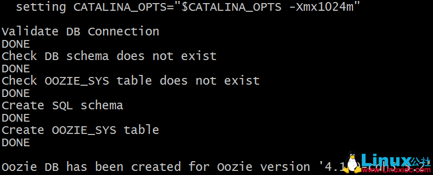[hadoop@fa01 oozie-4.1.0-cdh5.5.2]$ bin/ooziedb.sh create -sqlfile oozie.sql -run DB Connection