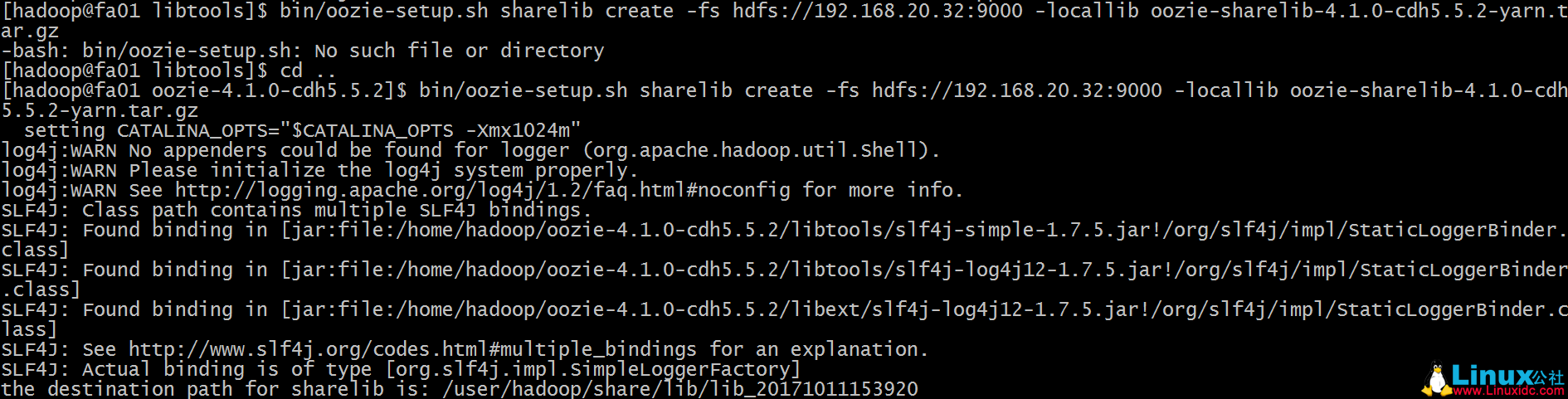 [hadoop@fa01 oozie-4.1.0-cdh5.5.2]$ bin/oozie-setup.sh sharelib create -fs hdfs://192.168.20.32:9000 -locallib oozie-sharelib-4.1.0-cdh5.5.2-yarn.tar.gz