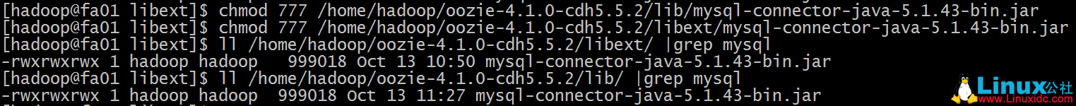 [hadoop@fa01 libext]$ chmod 777 /home/hadoop/oozie-4.1.0-cdh5.5.2/libext/mysql-connector-java-5.1.43-bin.jar