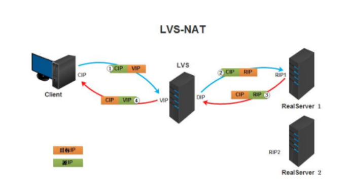 (f). Director Server 在响应客户端前,此时会将源 IP 地址修改为自己的 VIP 地址,然后响应给客户端。此时报文的源 IP 为 VIP,目标 IP 为 CIP