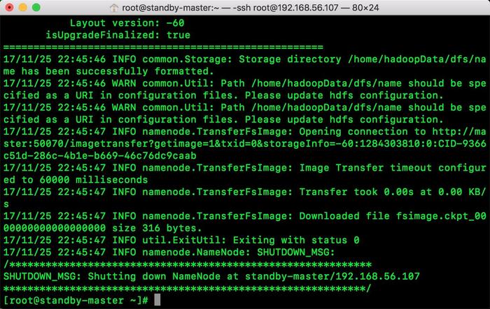 在 master 完成以上操作之后,再到 standby-master 重复以上的操作。(记得两个 NameNode 都要进行操作,重要的事再说一遍)。