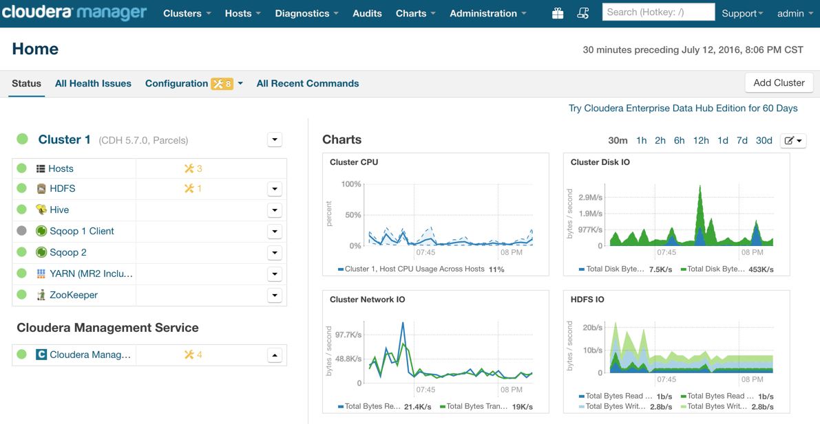 Hadoop 体系衍生了许多商业发行版,其中国内最常用的是 CDH。CDH 是在原生 apache hadoop 的基础上封装的发行版,拥有 Cloudera Manager (简称 CM,是一个管理、监控 CDH 运行的软件),将 hadoop 集群很好的监控和管理了起来,目前 CDH 最高版本是 5.7.x,对应 apache hadoop 2.7.x,这里我们采用 CDH 5.7.0。其安装的简要说明及系统要求见以下链接: