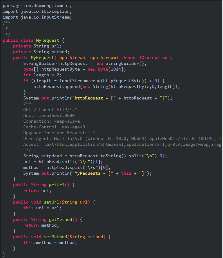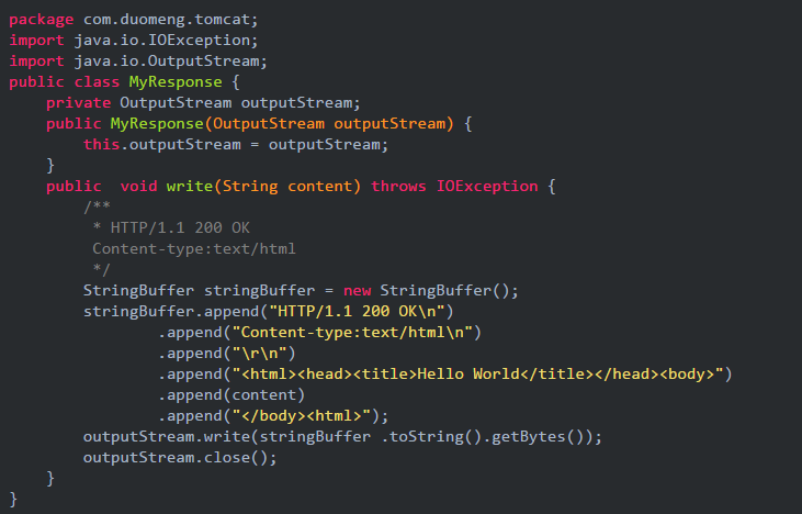 接下来我们就开始一步步实现,有 servlet 开发经验的对于 Request 和 Response 一定不陌生,所以就先实现自己的 Request 和 Response。首先实现 Response 如下所示。