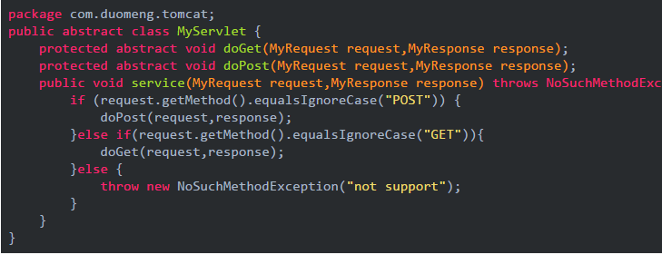 有了自己的请求信息和响应信息,那接下来就要写 servlet 了。通常写自己的 Servlet 的时候要继承一个 Servlet 的父类 HttpServlet,所以首先要写一个 Servlet 的父类,代码如下。