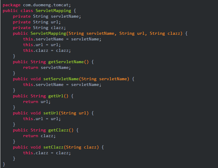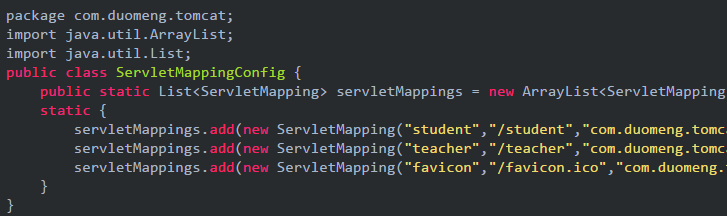 以上是每个具体的 Servlet 的信息,接下来要写一个存储有映射关系的类,代码如下。