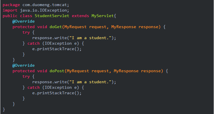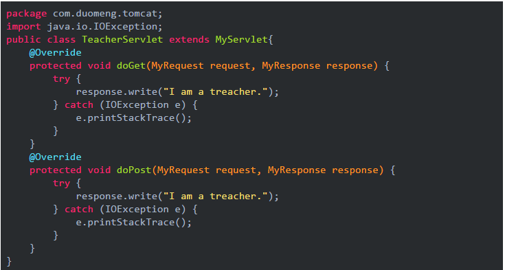 那么接下来就要写自己业务相关的 Servlet,这里写一个和学生相关的 Servlet,叫 StudentServlet,还有一个和老师相关的 Servlet,叫 TeacherServlet。具体的代码分别如下。