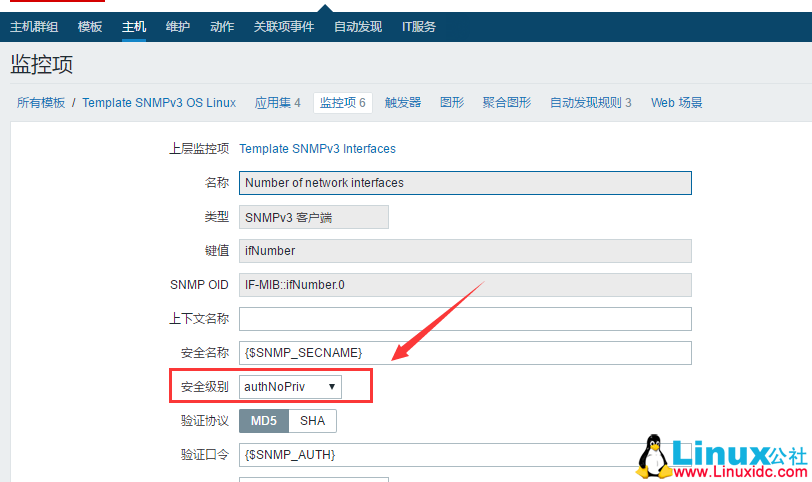 因模板使用的是:authPriv(既认证又加密)所以导入成功后,把“应用集、监控项、自动发现规则”下所有的认证模板更改为:authNoPriv