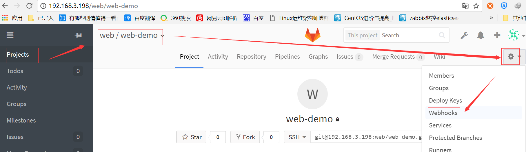 登录 gitlab, 在这个项目下找到钩子配置的地方