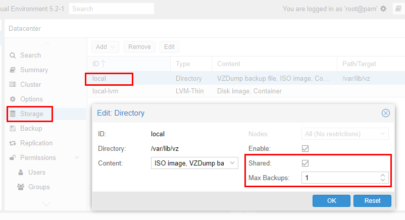 调整 pve- 1 节点的 local 存储池为共享池,这样可以只上传镜像到这个存储池,其他节点也可以共享使用,如下图: