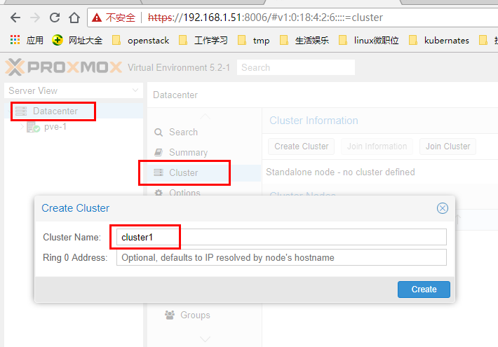 在其中一台 pve 服务器的 web 管理界面上首先创建一个集群,如下图: