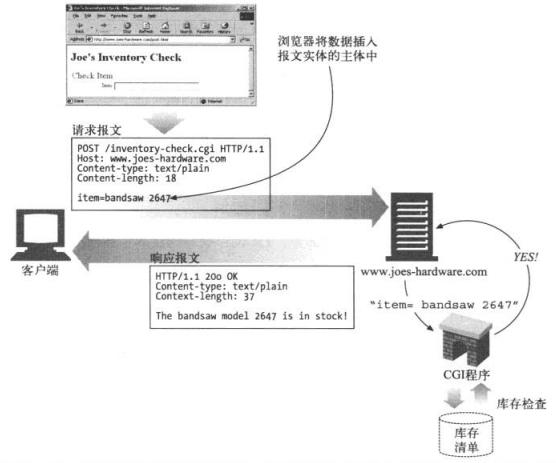 一般服务器通常提供一个表单,客户端填入数据后点击提交 (提交是数据都会放在请求报文的实体部分当中),然后由服务器将其发送到它要去的地方(比如,送到一个服务器的网关程序中,然后由这个程序对其进行处理);